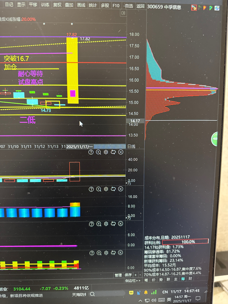 $中孚信息(SZ300659)$ 明天一定得走成仓,说了轿夫再利用暗盘出货,筹码峰显示已经出了一半加刚刚多1个单位,卖在轿夫出货第三天,也就是说第三天必须走的干干净净,短线19.4这里清错也要清仓