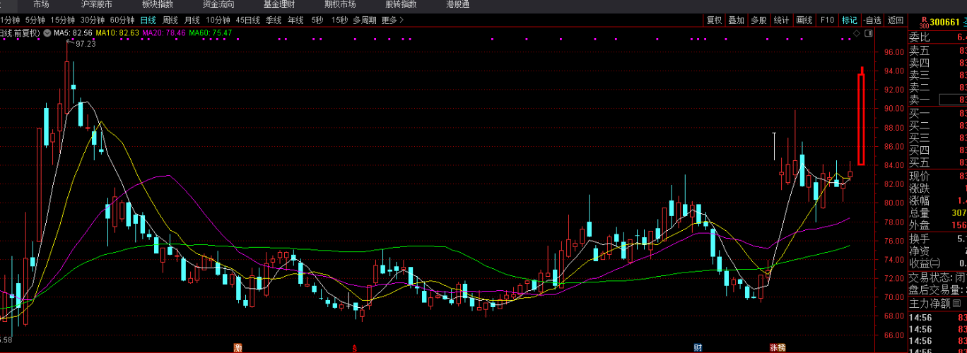 圣邦股份,预感强烈,接下来可能要暴涨了,不是漫涨,可能是沿着45度线上升,也属于