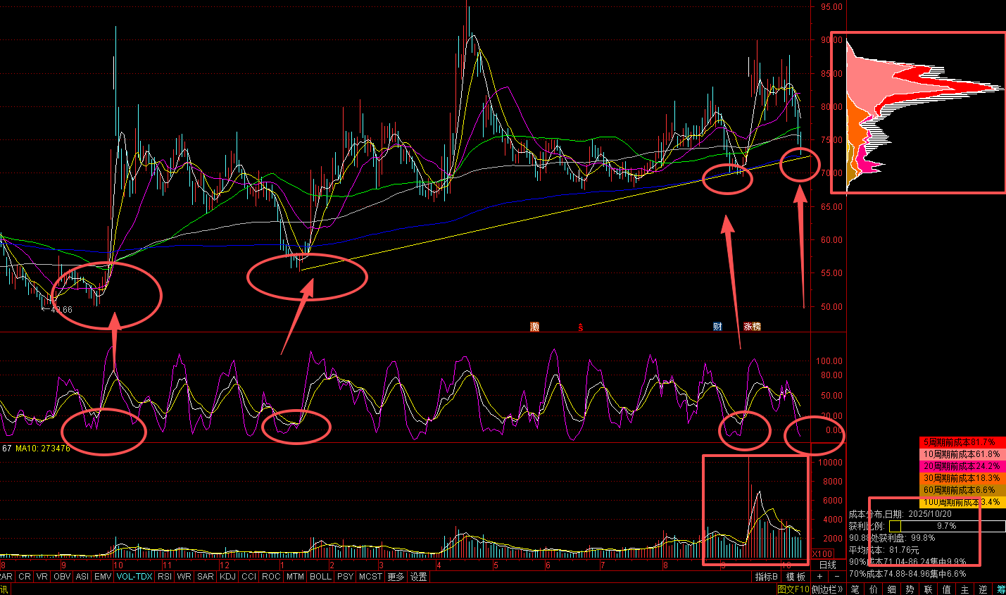 严重底背离,主力自己都是亏本的自己把自己套在山顶上,平均股价在82左右,,这里面一单拐头可能会快速拉升,这个地方不宜割肉,至少等一个反弹。