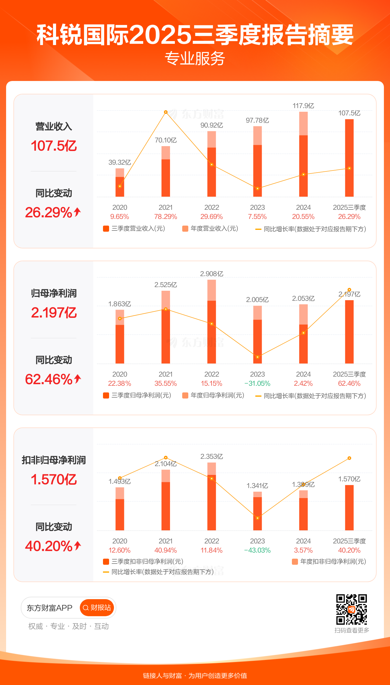 科锐国际10月30日发布2025年三季报显示,公司前三季实现营业收入107.55亿元,同比增长26.29%;归母净利润2.20亿元,同比增长62.46%;扣非归母净利润1.57亿元,同比增长40.20%。