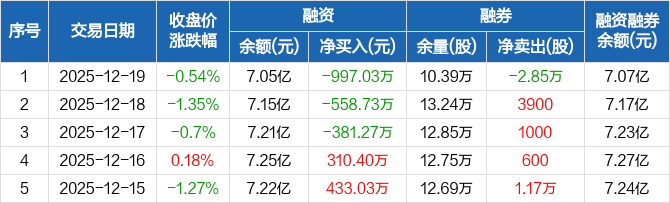 融资方面,当日融资买入999.97万元,融资偿还1997万元,融资净偿还997.03万元,连续3日净偿还累计1937.03万元。融券方面,融券卖出900股,融券偿还2.94万股,融券余量10.39万股,融券余额173.41万元。融资融券余额合计7.07亿元。