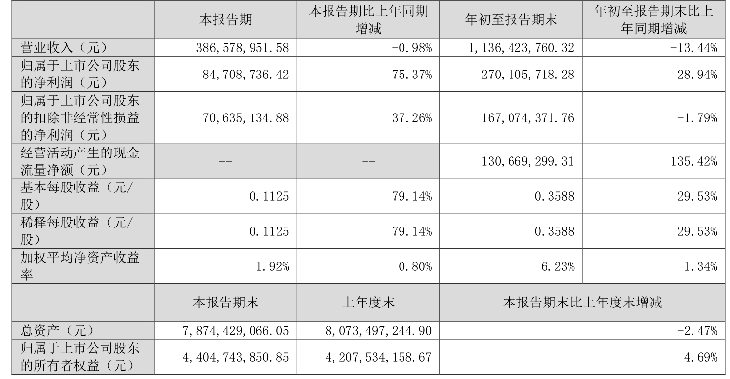 中证智能财讯鹏鹞环保(300664)10月24日披露2025年第三季度报告。前三季度公司实现营业总收入11.36亿元,同比下降13.44%;归母净利润2.7亿元,同比增长28.94%;扣非净利润1.67亿元,同比下降1.79%;经营活动产生的现金流量净额为1.31亿元,同比增长135.42%;报告期内,鹏鹞环保基本每股收益为0.3588元,加权平均净资产收益率为6.23%。