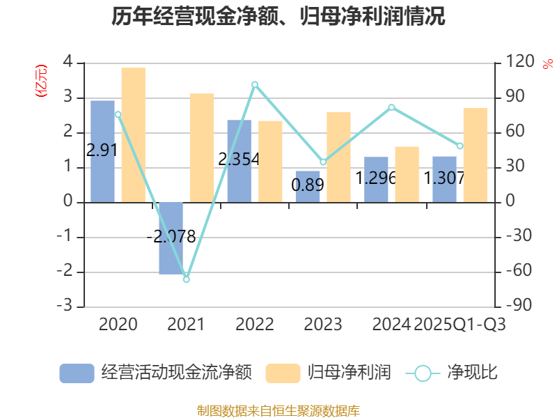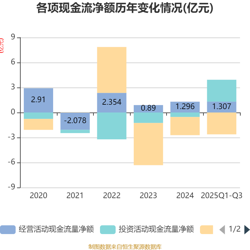 2025年前三季度,公司经营活动现金流净额为1.31亿元,同比增长135.42%;筹资活动现金流净额-2.62亿元,同比减少9441.35万元;投资活动现金流净额2.62亿元,上年同期为-2480.34万元。