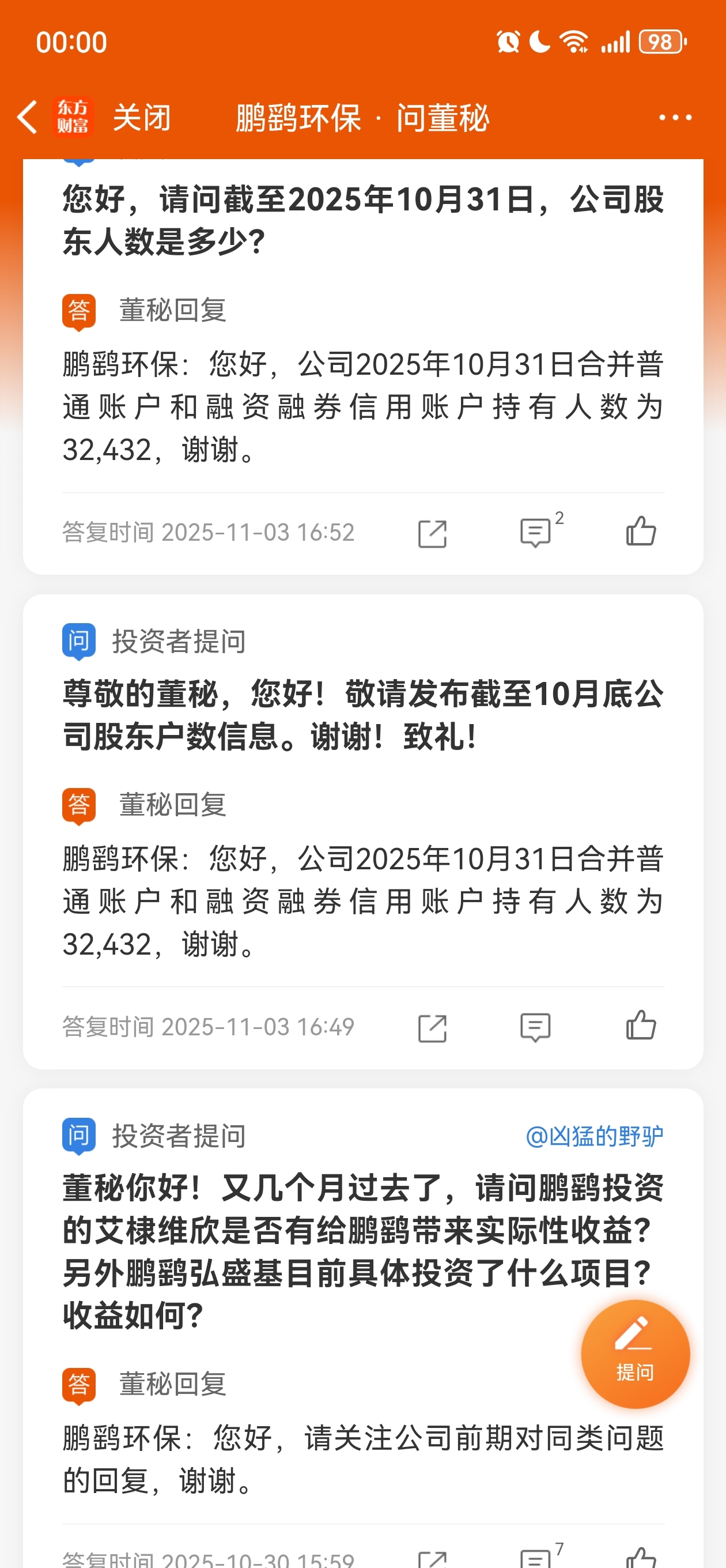 公司董秘严重不负责任,每个月有多少股东提问题?董秘每个月回答了几个股东提的问题?看一下这个截图,问股东人数的问题,隔几分钟连续回复两个同样的帖子,再看看后面的问题,人家清清楚楚的问,过了几个月之后,投资有没有收益,董秘叫人家去查历史答复,这种董秘怎么有脸拿工资的?