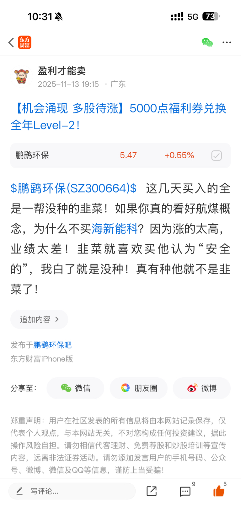 $鹏鹞环保(SZ300664)$ 我这人从来不搞马后炮,看看我11月的帖子,告诉你们看好航煤就买海新,看看海新今天涨9个点。今天再把话放这里,年报和一季报要让你们哭,按你们幻想的业绩砍一半,不信走着瞧!