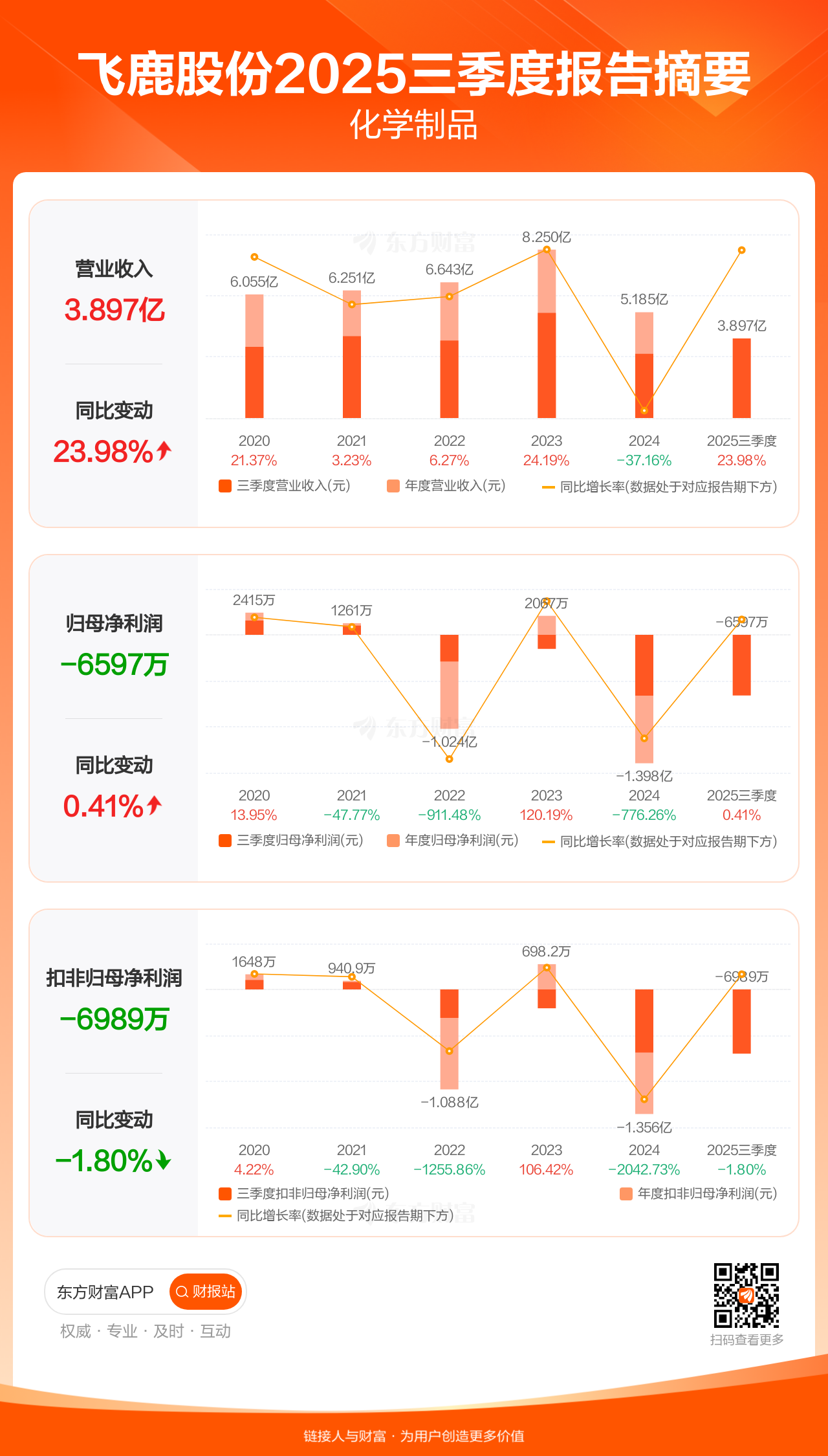 飞鹿股份10月30日发布2025年三季报显示,公司前三季实现营业收入3.90亿元,同比增长23.98%;归母净利润-6596.80万元;扣非归母净利润-6989.38万元。