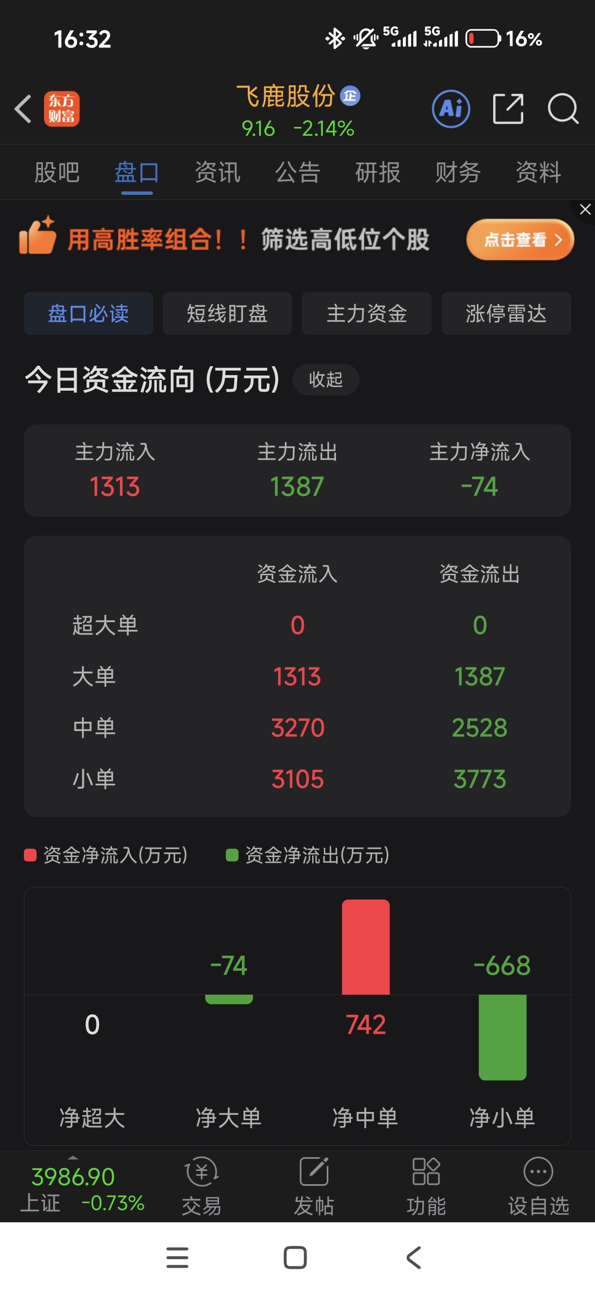 $飞鹿股份(SZ300665)$ 虽然跌但明显有资金进入了,洗了一批散户