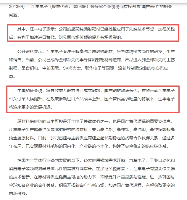 江丰电子表示:公司的超高纯溅射靶材已经批量应用于先端技术节点,加征关税后,有利于