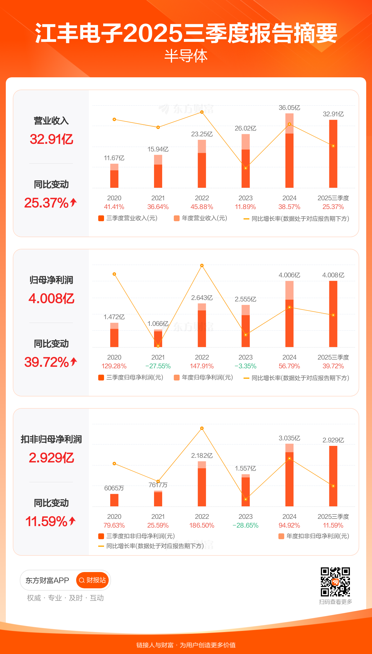 江丰电子10月28日发布2025年三季报显示,公司前三季实现营业收入32.91亿元,同比增长25.37%;归母净利润4.01亿元,同比增长39.72%;扣非归母净利润2.93亿元,同比增长11.59%。