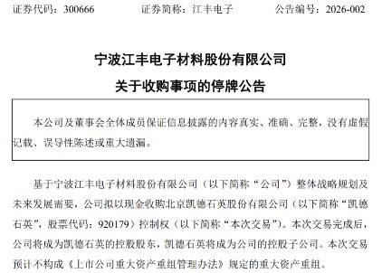 同日,凯德石英发布公告称,公司实际控制人张忠恕、王毓敏及其一致行动人张凯轩、北京德益诚投资发展中心(有限合伙)、北京英凯石英投资发展中心(有限合伙)正在筹划重大事项,拟将部分股权转让于宁波江丰电子材料股份有限公司,该事项可能导致公司控制权发生变更。