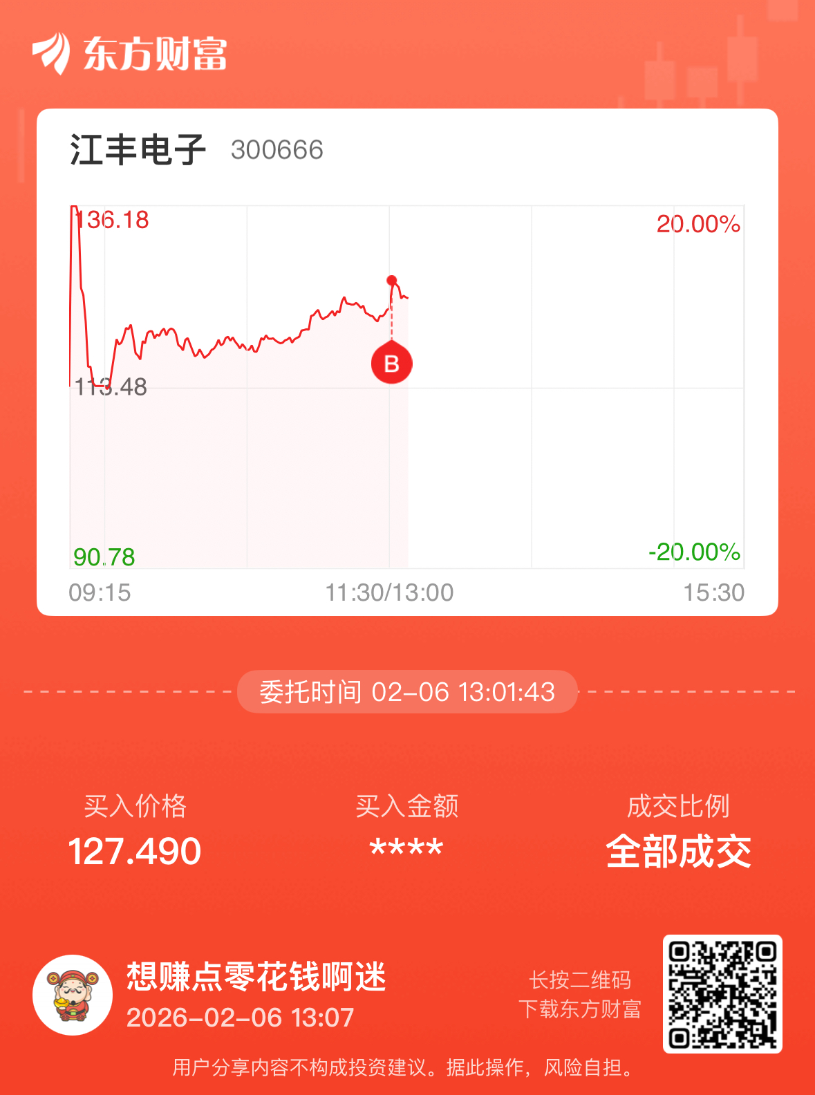 温馨提示: 1.根据《证券法》规定,禁止编造、传播虚假信息或者误导性信息,扰乱证券市场;2.用户在本社区发表的所有资料、言论等仅代表个人观点,与本网站立场无关,不对您构成任何投资建议。用户应基于自己的独立判断,自行决定证券投资并承担相应风险。《东方财富社区管理规定》