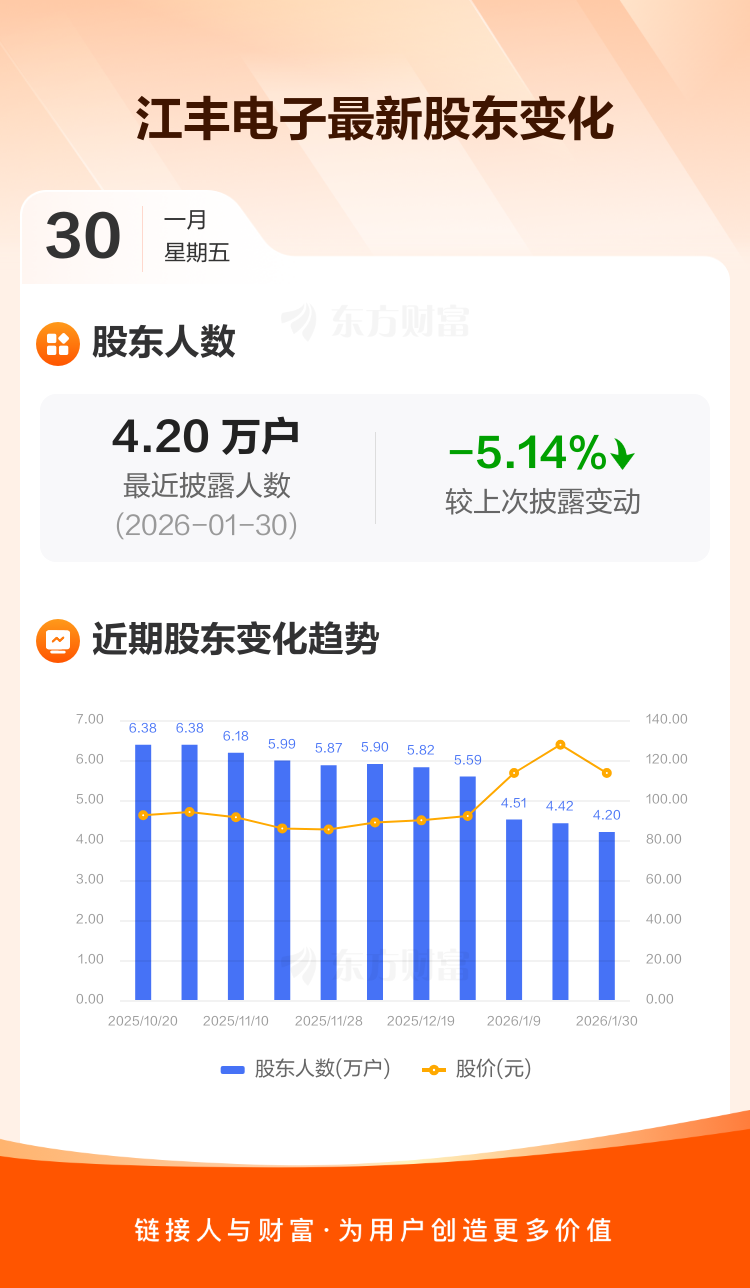 江丰电子:截至1月30日最新股东户数4.20万户,较上期减少5.14%
