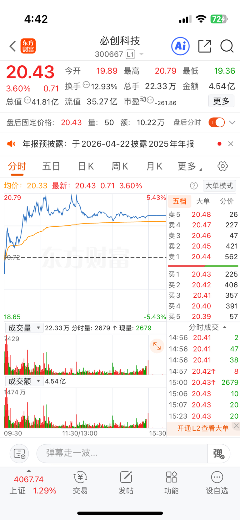 $必创科技(SZ300667)$ 不懂就问,为啥分时图三点后还有半个小时?