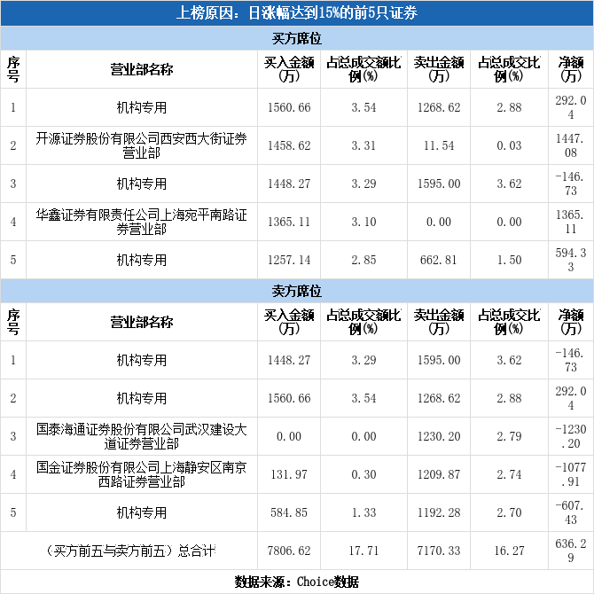 龙虎榜数据显示,今日共6个机构席位出现在龙虎榜单上,分别位列买一、买三、买五、卖一、卖二、卖五,合计净买入132.20万元,占龙虎榜净买额的20.78%。除此之外还有海南发展、西部材料、超捷股份等34只个股榜单上出现了机构的身影,其中14家呈现机构净买入,获净买入最多的是海南发展,净买额为2.89亿元;20家呈现机构净卖出,其中遭净卖出最高的为天际股份,净卖额为2.13亿元。