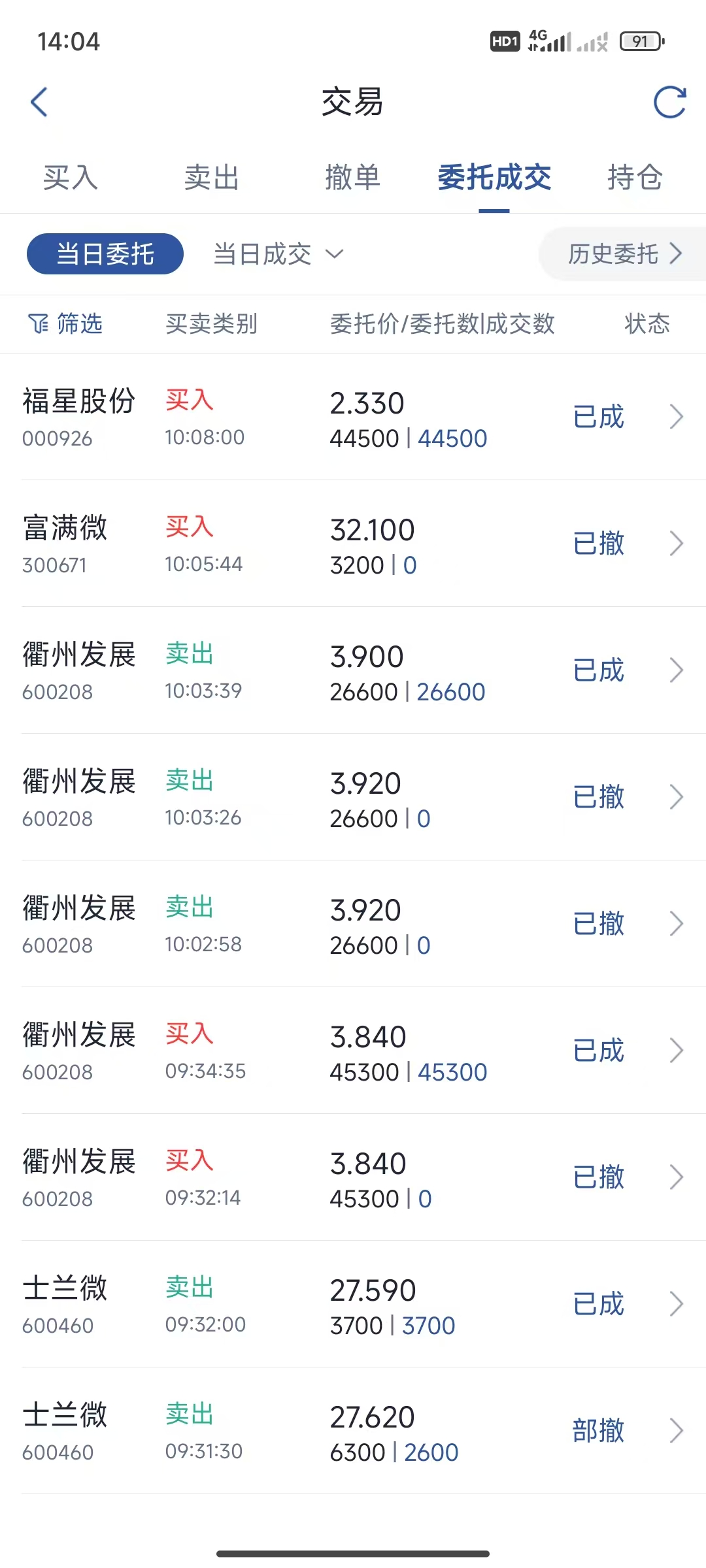 看看今天做的T我的交割单,等周一福星跟衢州冲高我再回来啊!