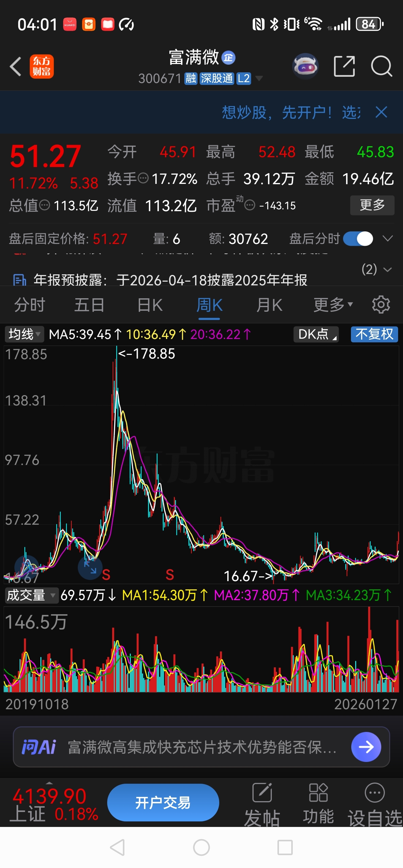 富满微还在底部,上升空间巨大,跌了四年,至少涨到100吧