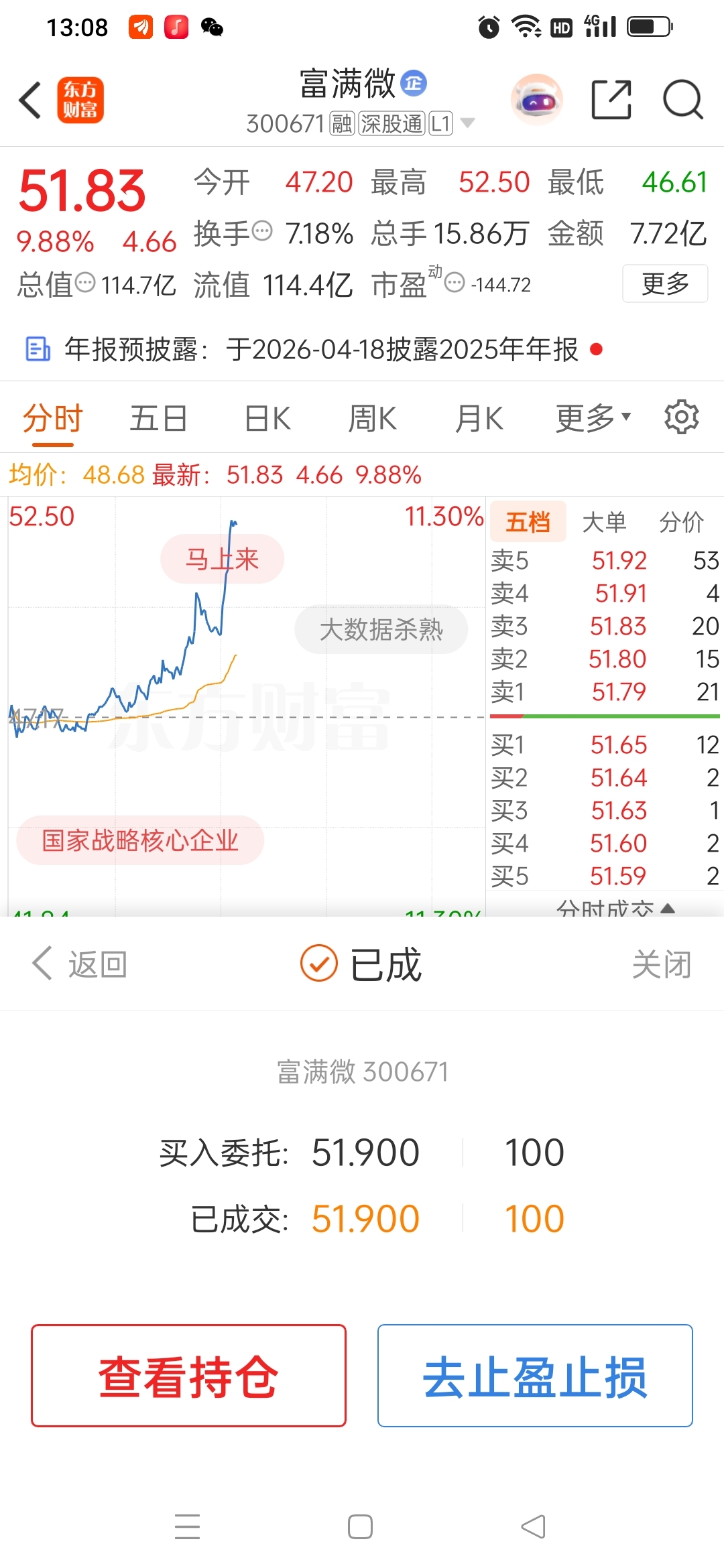 $富满微(SZ300671)$ 不好意思了各位, 一手买崩