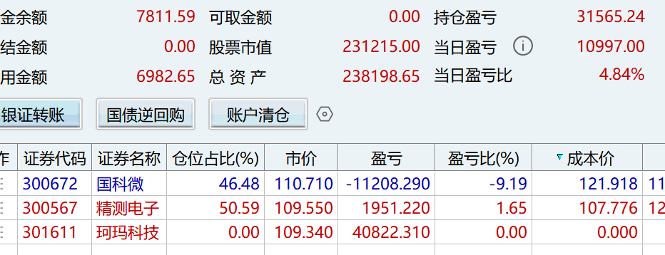预判今日半导体会大涨,开盘110走了301611,高开太多心虚,主要是杀出来一11111的高点,感觉今日涨停的概率比较低了,或许高开太多,就没有格局,原计划略微低开冲高我格局不动了。大高开又让我双飞的心思动了起来,结果买了一个犯天条的国科微,其实国科微是有瑕疵,昨日虽然大涨,但是没有放量,今日开盘买他有些堵放量大涨的味道了,没有出现明确放量大涨的走势是不应该进去,也不符合自己的。在后面买了精测电子补救一下,其实手中好的股很多,301550低吸也是非常不错的,都一开始被301611大高开吸引眼球,把其他的都忘记了,关注了几天的邵阳液压前几天也是庄家吸货的走势,因为是商业航天,心里有些排斥了,持续涨了好几天了,最近这两天最强的几个股走势都开始在减弱了