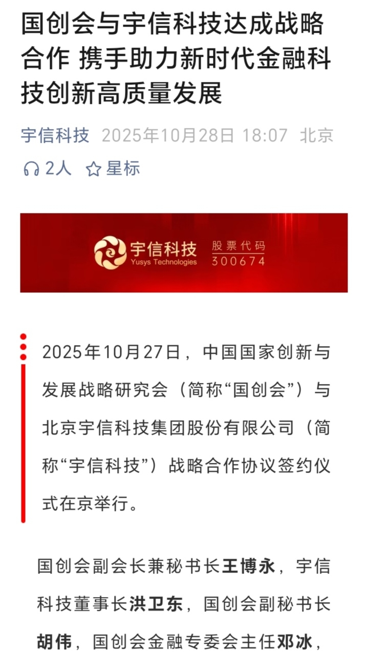2025年10月27日,中国国家创新与发展战略研究会(简称“国创会”)与北京宇信科技集团股份有限公司(简称“宇信科技”)战略合作协议签约仪式在京举行。