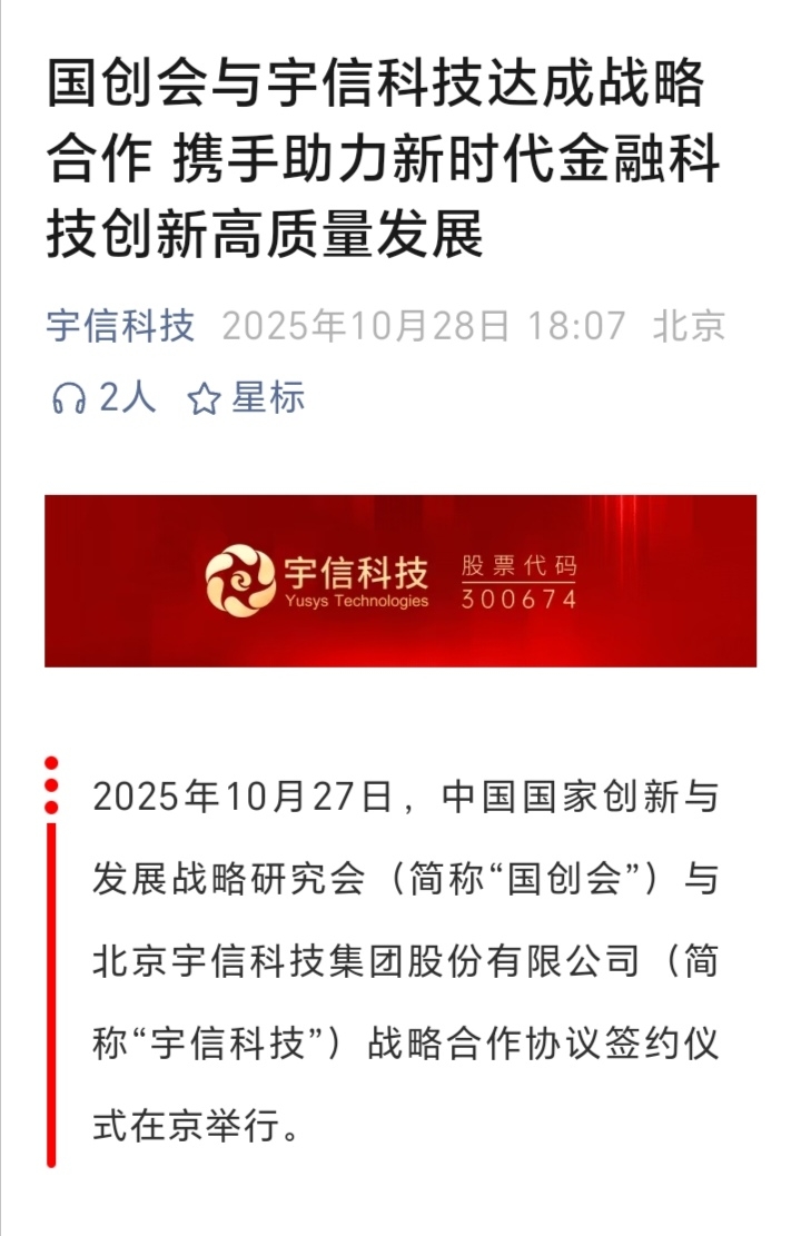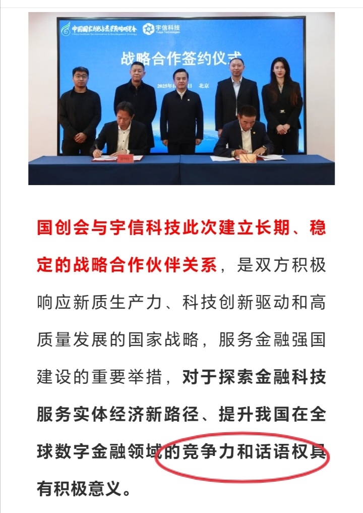 2025年10月27日,中国国家创新与发展战略研究会(简称“国创会”)与北京宇信科技集团股份有限公司(简称“宇信科技”)战略合作协议签约仪式在京举行。