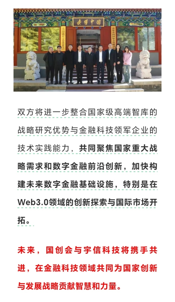 国创会与宇信科技建立长期、稳定的战略合作伙伴关系,提升我国在全球数字金融领域的竞争力和话语权。共同聚焦国家重大战略需求…