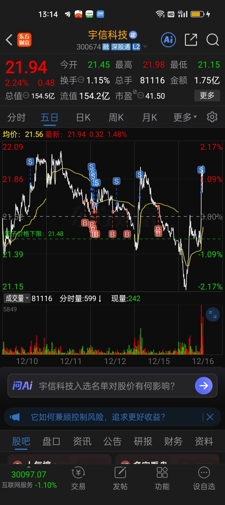 $宇信科技(SZ300674)$ 被套每下降2元准备一笔资金无限t.量化去了,融资同样性质,拉升就跑,跌下再买,每层钱解放出来继续t。