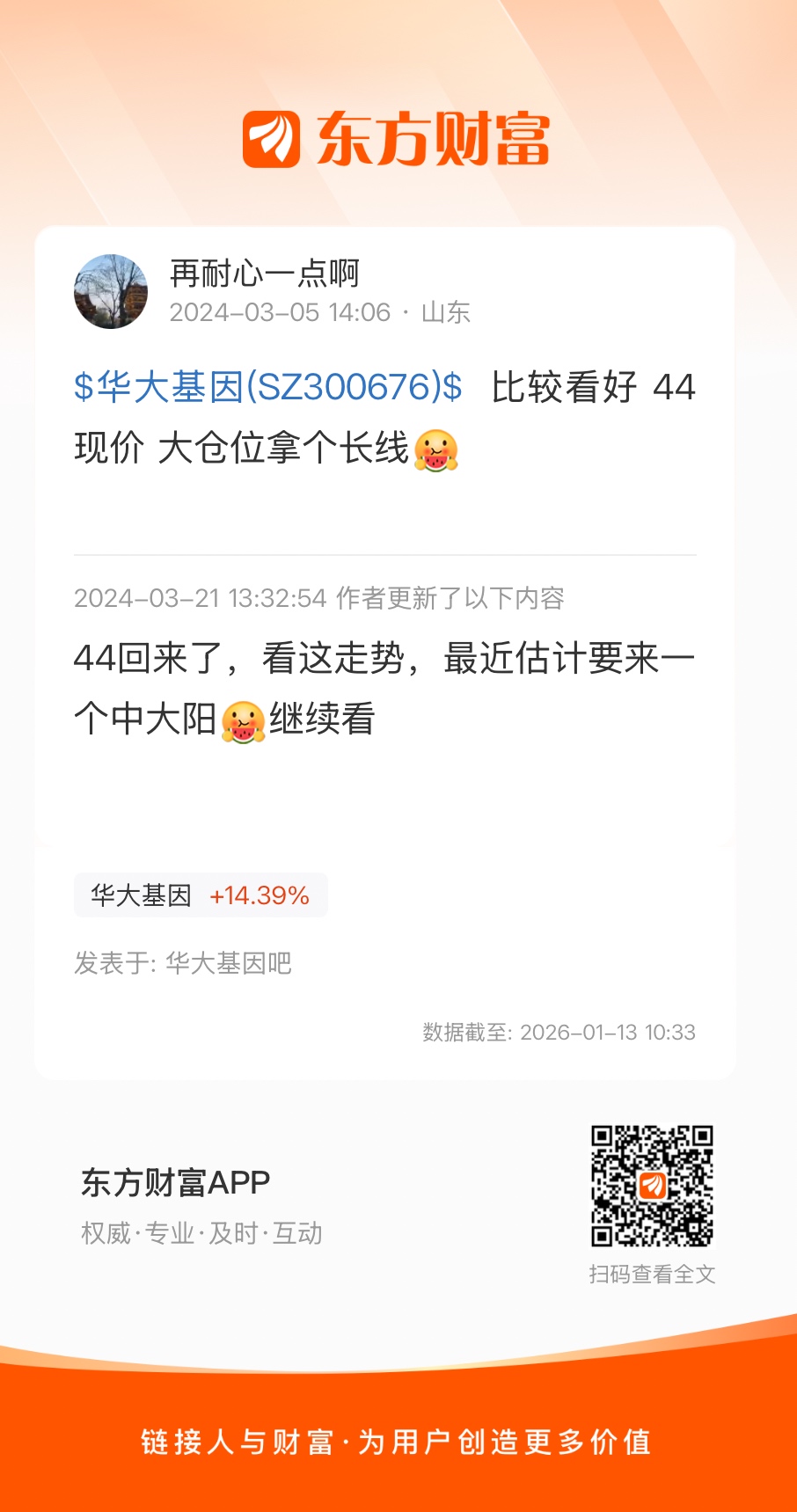 $华大基因(SZ300676)$  比较看好 44现价 大仓位拿个长线