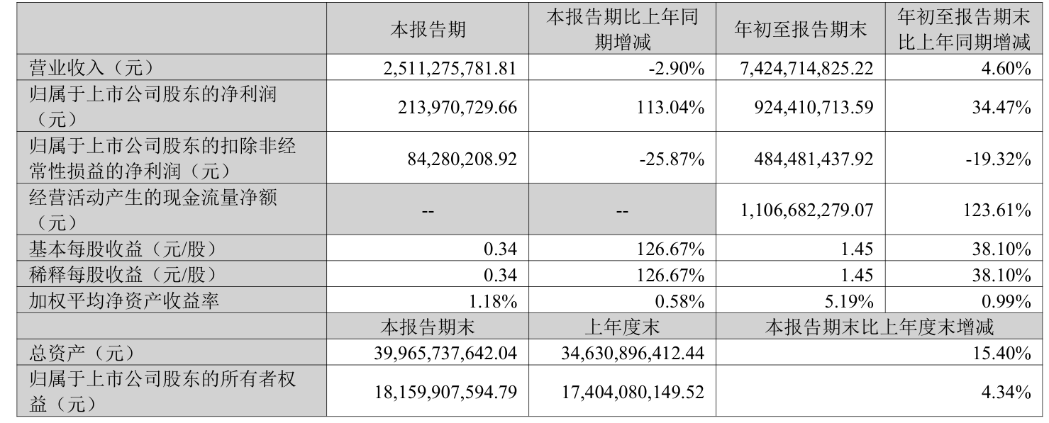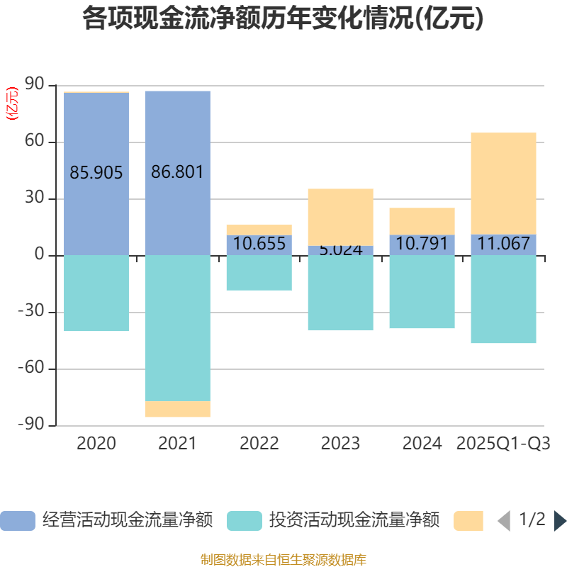 2025年前三季度,公司经营活动现金流净额为11.07亿元,同比增长123.61%;筹资活动现金流净额53.78亿元,同比增加28.4亿元;投资活动现金流净额-46.56亿元,上年同期为-23.92亿元。