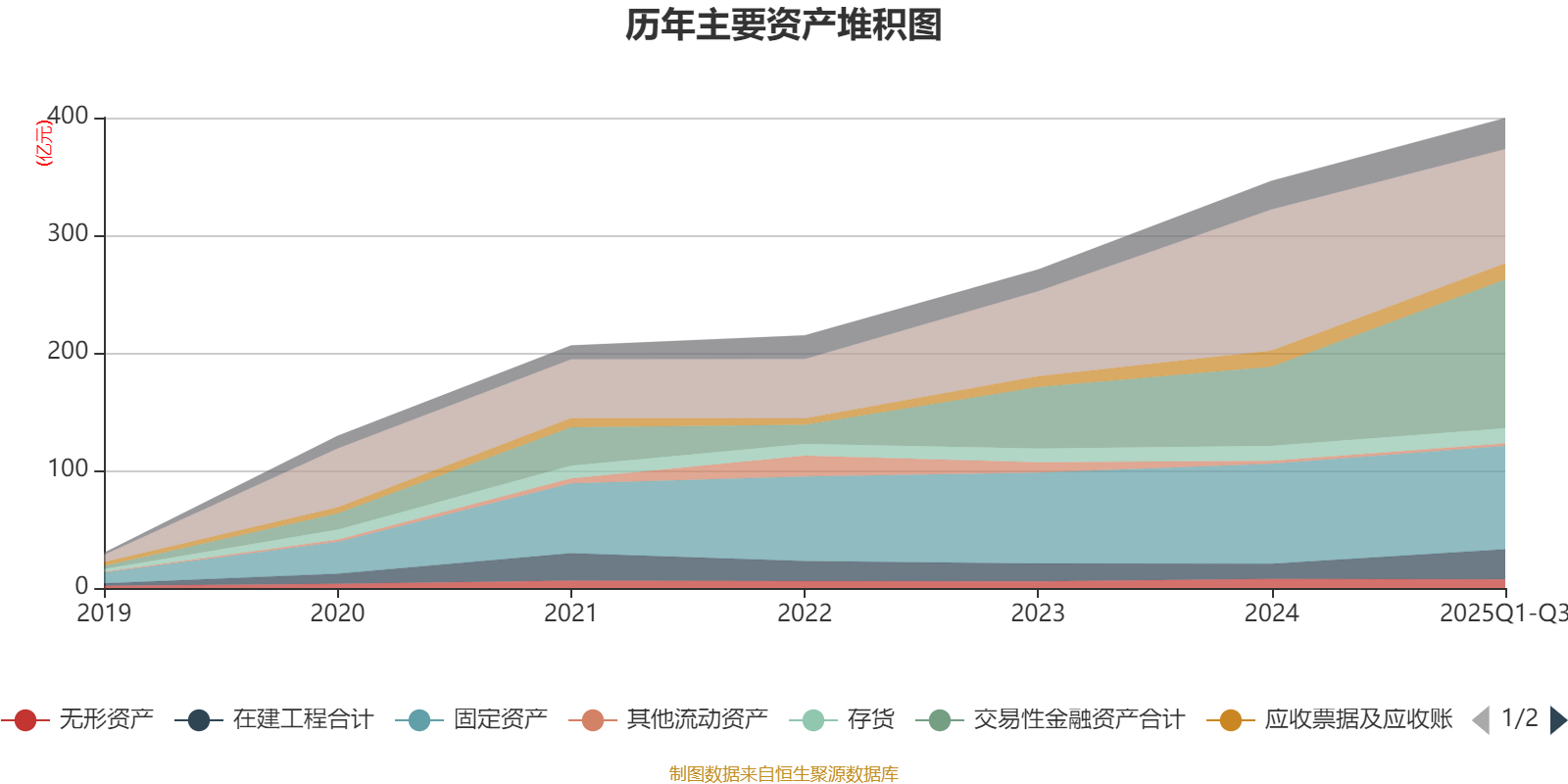 资产重大变化方面,截至2025年三季度末,公司交易性金融资产合计较上年末增加87.6%,占公司总资产比重上升12.17个百分点;货币资金较上年末减少19.28%,占公司总资产比重下降10.43个百分点;在建工程合计较上年末增加98.93%,占公司总资产比重上升2.69个百分点;固定资产较上年末增加3.49%,占公司总资产比重下降2.54个百分点。