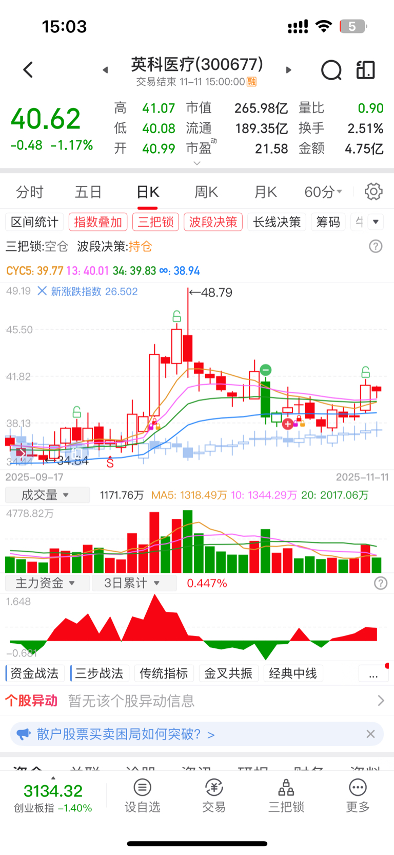 $英科医疗(SZ300677)$ 昨天提示卖出信号,今天还没有三把锁买入信号,但感觉支撑力度挺强的
