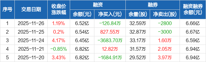 融资方面,当日融资买入5146.86万元,融资偿还5273.7万元,融资净偿还126.84万元。融券方面,融券卖出3600股,融券偿还6400股,融券余量32.59万股,融券余额1327.57万元。融资融券余额合计6.66亿元。