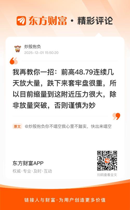 哈哈哈哈哈//@炒股抱负 : 我再教你一招:前高48.79连续几天放大量,跌下来套牢盘很重,所以目前缩量到这附近压力很大,除非放量突破,否则谨慎为妙