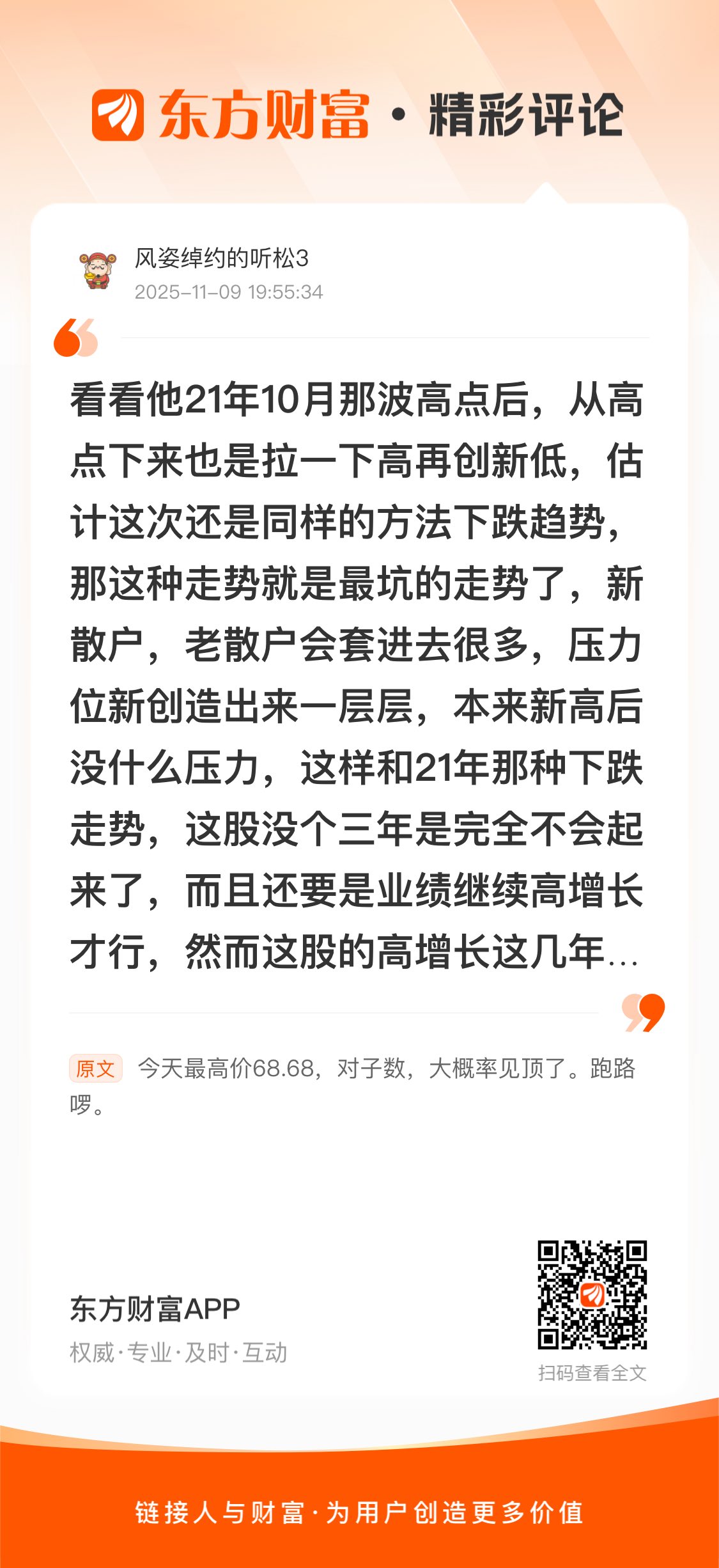 //@风姿绰约的听松3 : 看看他21年10月那波高点后,从高点下来也是拉一下高再创新低,估计这次还是同样的方法下跌趋势,那这种走势就是最坑的走势了,新散户,老散户会套进去很多,压力位新创造出来一层层,本来新高后没什么压力,这样和21年那种下跌走势,这股没个三年是完全不会起来了,而且还要是业绩继续高增长才行,然而这股的高增长这几年已经耗费很多了,想保持下去这种市场情况很难,所以我是主力,也会想先出货一部分,股价先下来再说。