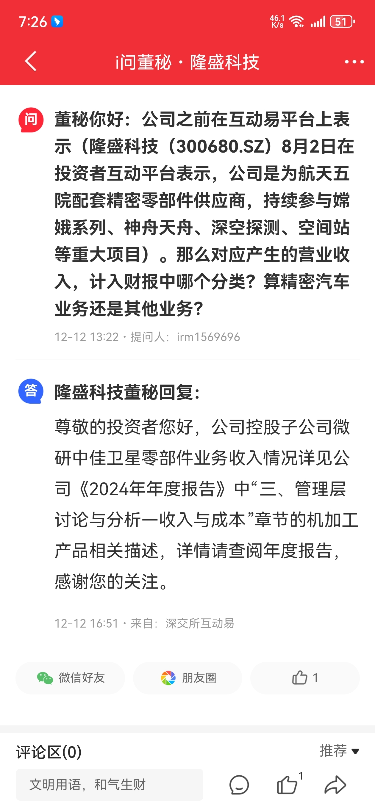 隆盛科技在商业航天领域的收入为2300万,占2024年营收不足1%。董秘其实已经说的很清楚了,只是大家都没有去细看2024年度报告而已。