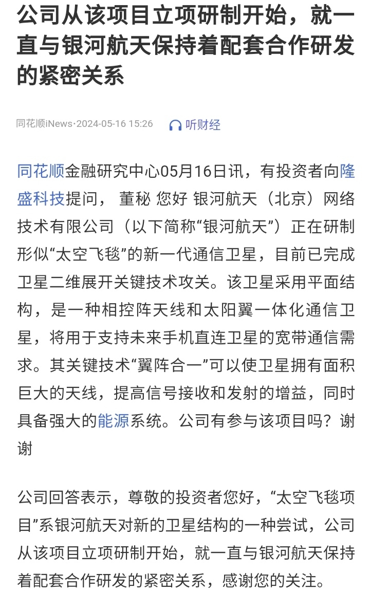 $隆盛科技(SZ300680)$ 隆盛科技与银河航天联合研制的“太空飞毯”翼阵合一的新一代平板卫星才是未来太空算力和手机直连的最佳解决方案。