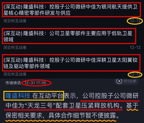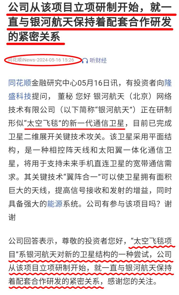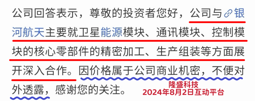 隆盛科技:与银河航天同在无锡航天生产基地,2024年3月14日公司公告:控股子公司微研中佳近日与银河航天签署《战略合作协议》,双方本着深度合作、相互促进、互利共赢的长远发展战略的考虑,结合各自技术及实践积累,