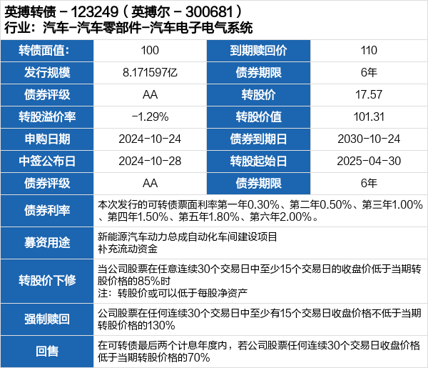参考当前评级、规模等因子相似,正股行业相同的转债当前市场表现,英搏转债上市首日转股溢价率区间预计为32% ~ 39%,对应首日收盘价预计区间在133.73 ~ 140.82元。