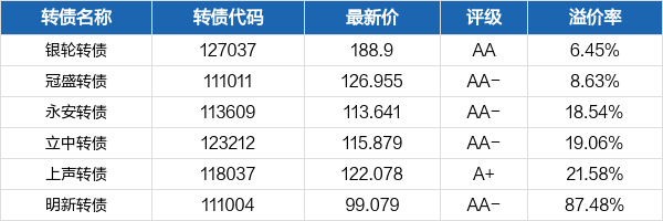 当前英搏转债溢价率 = 100% *(债券面值 / 转股价值 - 1) = 100% *(100 / 101.31 - 1) = -1.29%。结合行业、评级等因素后筛选出如下相似转债: