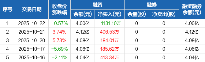 英搏尔:融资净偿还1131.1万元,融资余额4亿元(10-22)