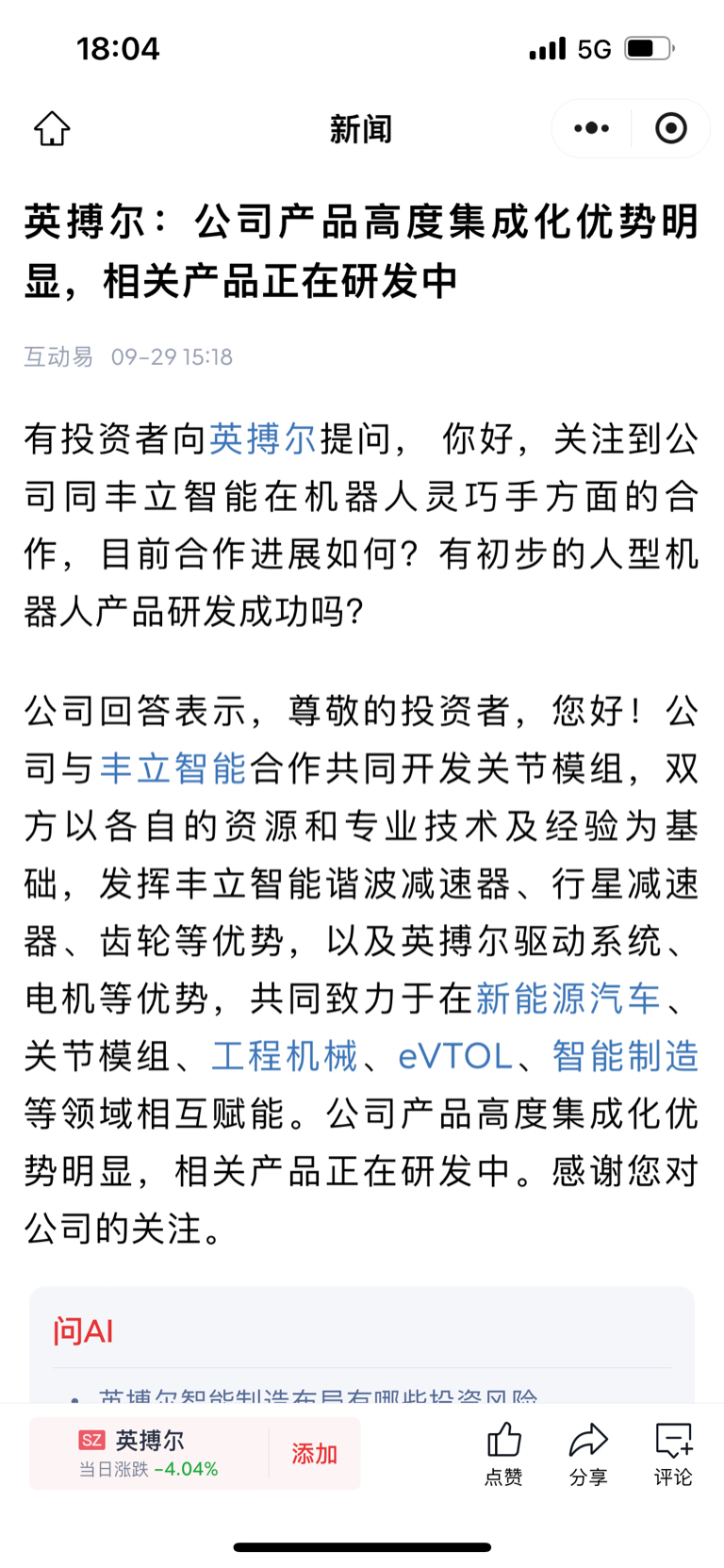 $英搏尔(SZ300681)$ 第一,筹码高度集中,主力吸筹早已完成。第二,机器人灵巧手很快问世(耐心等待)目前在申请专利中。第三,低空经济+灵巧手+其他业务,综合预计达到250亿市值,目前低估值,拿好坐稳,此票未来看三倍!择机起飞