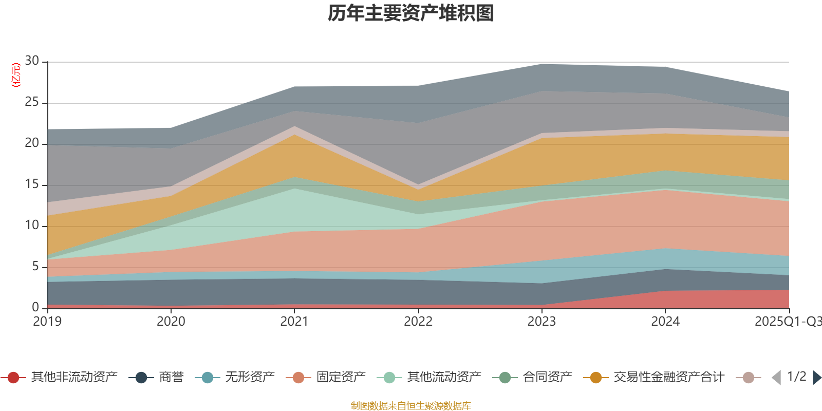 资产重大变化方面,截至2025年三季度末,公司货币资金较上年末减少59.55%,占公司总资产比重下降7.84个百分点;交易性金融资产合计较上年末增加17.02%,占公司总资产比重上升4.64个百分点;商誉较上年末减少32.25%,占公司总资产比重下降2.2个百分点;其他非流动资产较上年末增加4.77%,占公司总资产比重上升1.21个百分点。