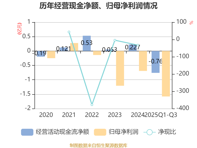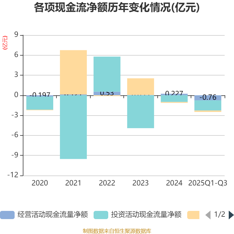 2025年前三季度,公司经营活动现金流净额为-7604.03万元,同比减少1.04亿元;筹资活动现金流净额-2162.92万元,同比减少647.18万元;投资活动现金流净额-1.52亿元,上年同期为-2774.49万元。