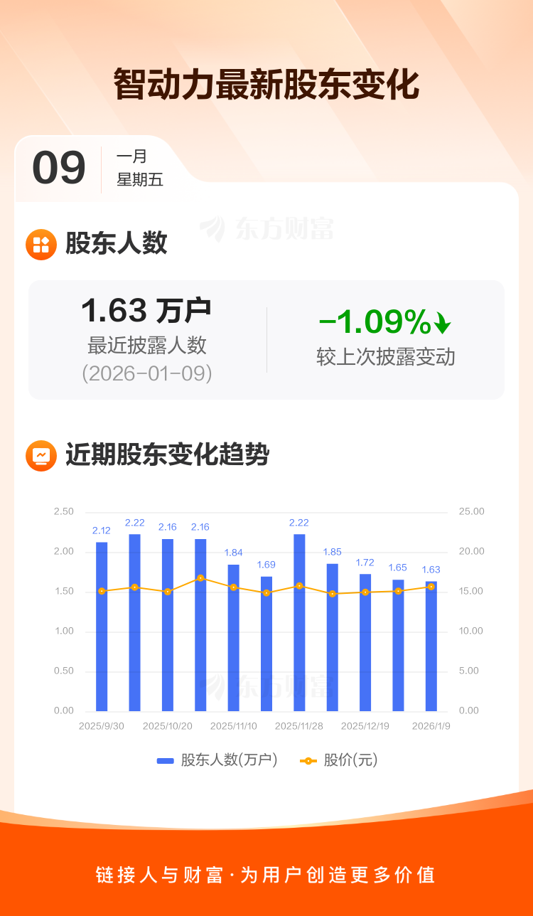 智动力:截至1月9日最新股东户数1.63万户,较上期减少1.09%