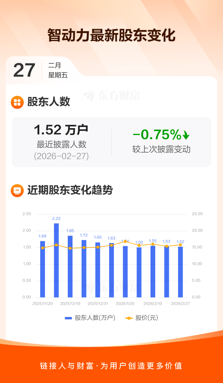 智动力:截至2月27日最新股东户数1.52万户,较上期减少0.75%