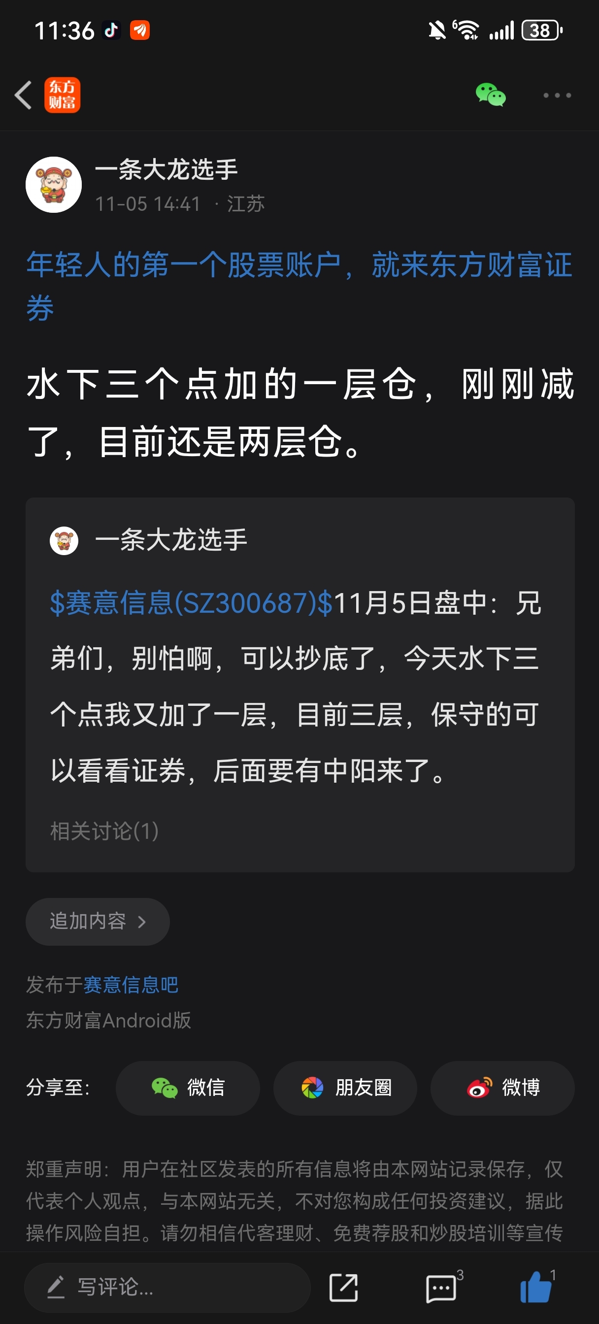 温馨提示: 1.根据《证券法》规定,禁止编造、传播虚假信息或者误导性信息,扰乱证券市场;2.用户在本社区发表的所有资料、言论等仅代表个人观点,与本网站立场无关,不对您构成任何投资建议。用户应基于自己的独立判断,自行决定证券投资并承担相应风险。《东方财富社区管理规定》