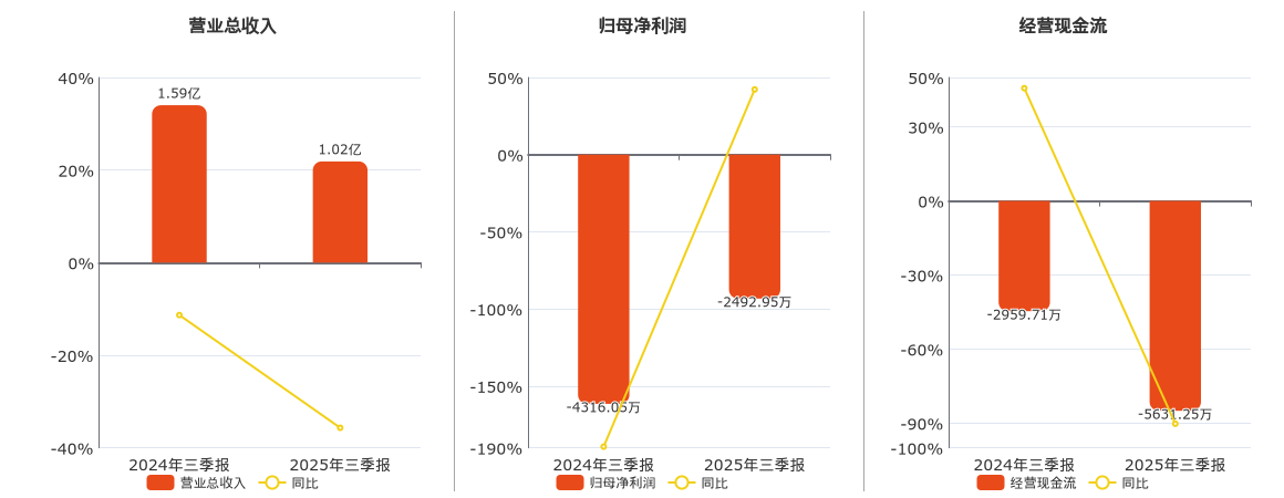 公司营业总收入为1.02亿元,较去年同报告期营业总收入减少5668.12万元,同比较去年同期下降35.68%。归母净利润为-2492.95万元。经营活动现金净流入为-5631.25万元,较去年同报告期经营活动现金净流入减少2671.54万元。