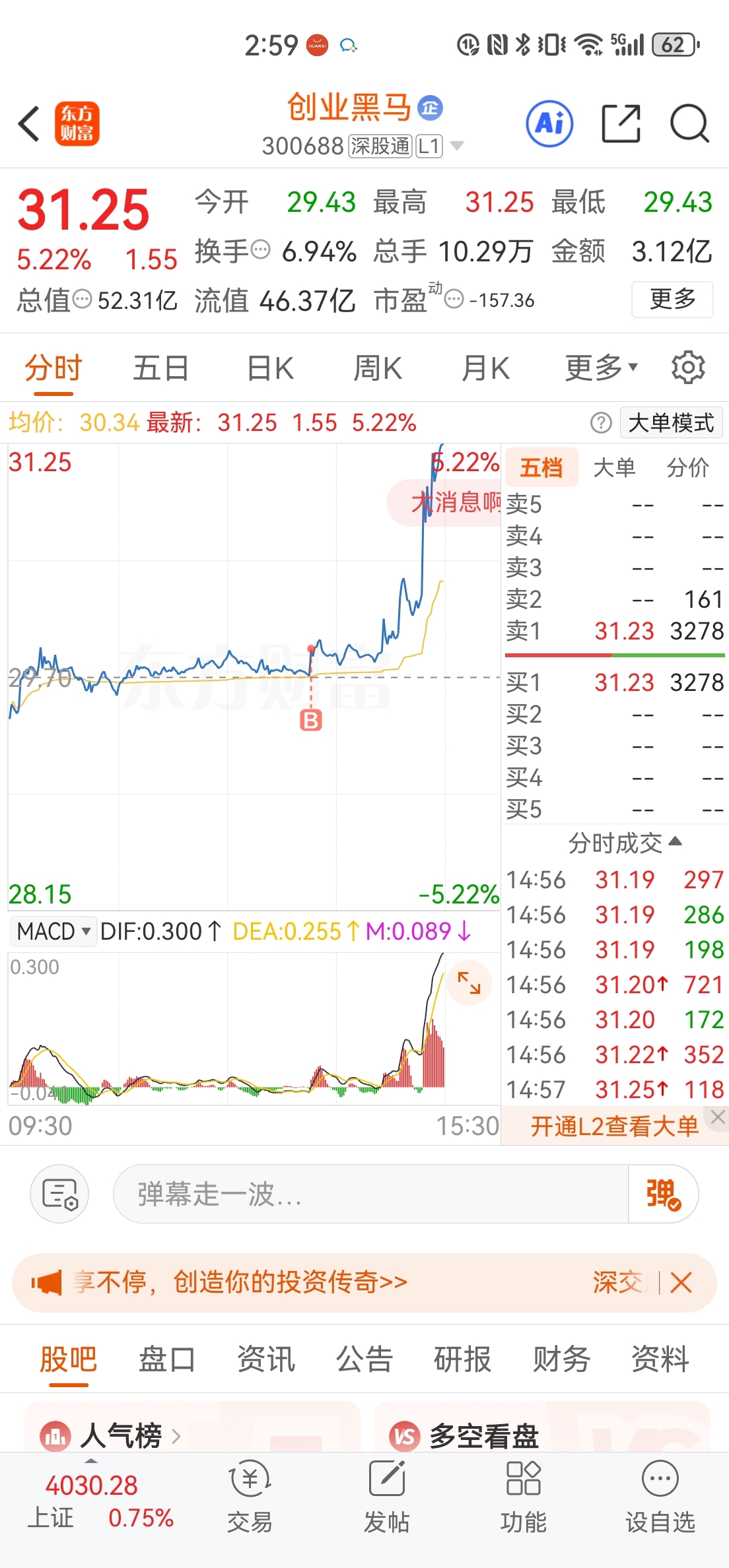 $创业黑马(SZ300688)$ 一加仓就拉…