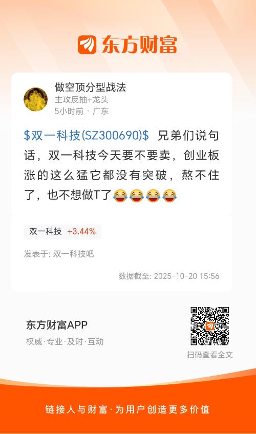 $双一科技(SZ300690)$  兄弟们说句话,双一科技今天要不要卖,创业板涨的这么猛它都没有突破,熬不住了,也不想做T了