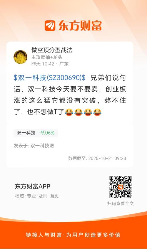 $双一科技(SZ300690)$  兄弟们说句话,双一科技今天要不要卖,创业板涨的这么猛它都没有突破,熬不住了,也不想做T了
