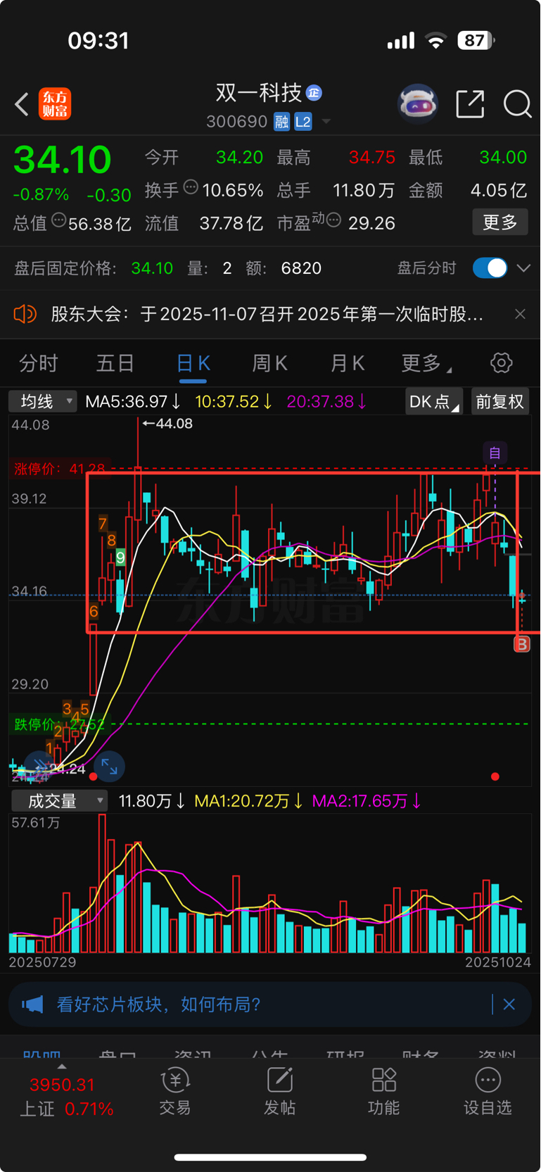 $双一科技(SZ300690)$ 在这个区间,一直有主力维护股价,不跌破箱体,也没有冲破箱体,我的理解就是主力震荡吸筹,这个股,盘子小,业绩爆表,题材好,就看主力什么时候点火起飞了,毕竟已经横盘震荡两个多月了